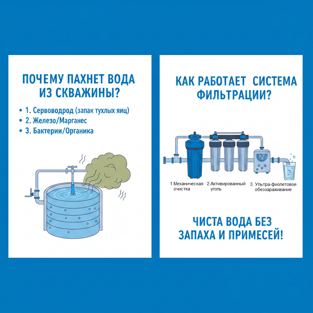 Чистая вода — основа здоровья и комфорта в загородном доме. Однако владельцы скважин нередко сталкиваются с неприятными запахами, исходящими из крана. Разберемся, почему это происходит и как современные системы фильтрации решают эти проблемы. Наиболее распространенная причина. Появляется из-за деятельности сульфатредуцирующих бактерий в условиях отсутствия кислорода. Эти микроорганизмы преобразуют сульфаты в сероводород. Особенно характерно для глубоких артезианских скважин. Придают воде металлический привкус и запах. При контакте с кислородом растворенное железо окисляется, образуя рыжий осадок и характерный запах. Запах земли, плесени или гнили может указывать на наличие органических соединений, попадающих в скважину с поверхностными водами. Запах фенола, нефтепродуктов или хлора свидетельствует о промышленном загрязнении водоносного горизонта. Избыток солей (например, соленый привкус) меняет не только вкус, но и запах воды. Современная водоочистка — это многоступенчатый процесс, ада