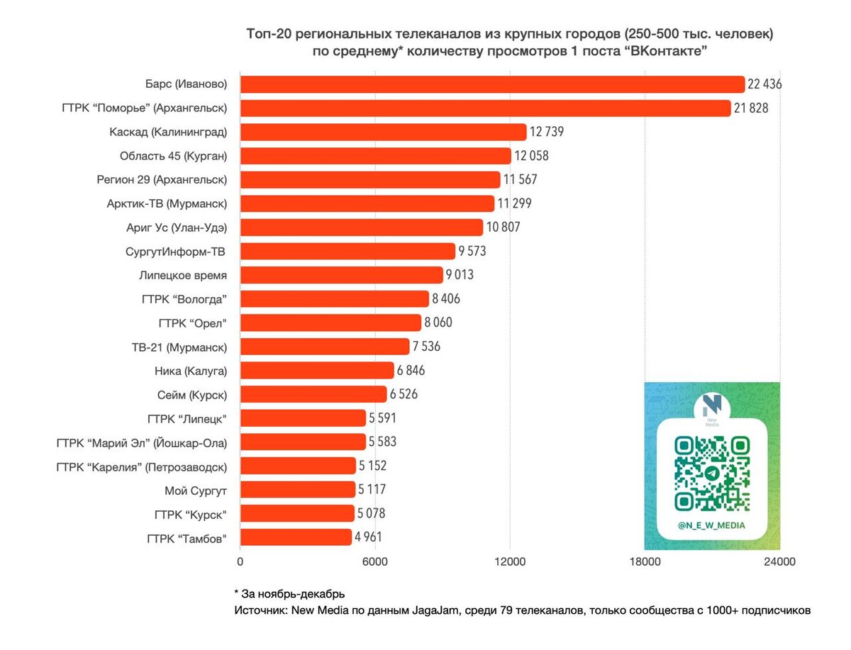 Речь о рейтинге по среднему количеству просмотра постов ВКонтакте, который опубликовал Telegram-канал New Media. И это — среди 79 телеканалов. Первое место заняли наши коллеги из Иваново, а второе — ГТРК «Поморье». КАСКАД 📺 Прислать новоcть