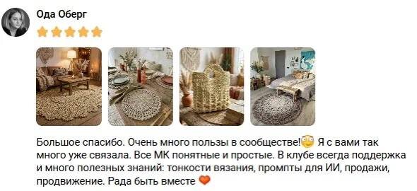 Люди смотрят такие отзывы, думают: «Ага, понятно», и пролистывают дальше. Не потому что не нужно, а потому что не сейчас. А потом проходит время, и вдруг выясняется, что кто-то уже связал первый ковёр, попробовал ИИ, перестал прокрастенировать, а кто-то уже даже продал своё изделие и взял заказ на новое. Скрины выше как раз про тех, кто в какой-то момент решил не откладывать 😉 Смотреть нормально. Просто в какой-то момент либо вы внутри, либо читаете чужие результаты.