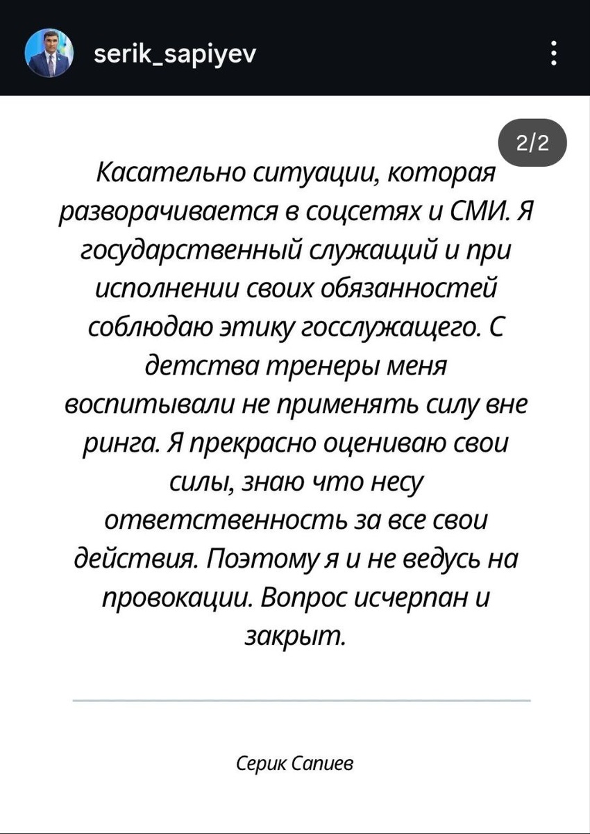 «Не ведусь на провокации»: Сапиев прокомментировал конфликт со своим заместителем Руководитель управления физической культуры и спорта Карагандинской области, олимпийский чемпион по боксу Серик Сапиев прокомментировал скандальный инцидент со своим заместителем Дауреном Есимхановым. «Касательно ситуации, которая разворачивается в соцсетях и СМИ. Я государственный служащий и при исполнении своих обязанностей соблюдаю этику госслужащего. С детства тренеры меня воспитывали не применять силу вне ринга. Я прекрасно оцениваю свои силы, знаю что несу ответственность за все свои действия. Поэтому я и не ведусь на провокации. Вопрос исчерпан и закрыт». Присылайте фото, видео и информацию анонимно — в наш бот t.me/CentralMedia24_KZbot или на WhatsApp +77080323818 😎Следите за новостями тут: https://dzen.ru/id/67fc8dffe608bc669477821e