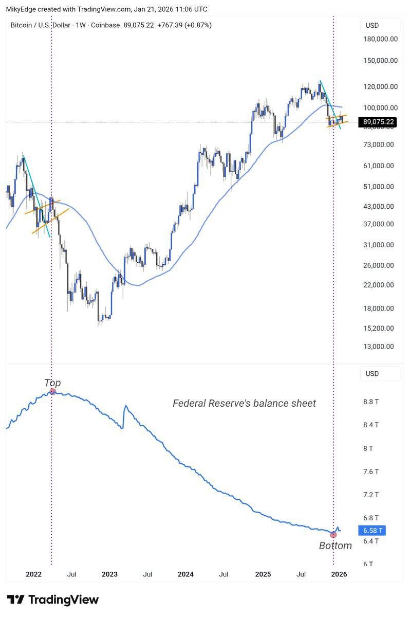 Иногда рынок любит играть в déjà vu. Берут фрагмент графика, обводят флаг — и говорят: «смотрите, это уже было». В 2022 это действительно выглядело похоже. Медвежий флаг, потеря средней, аккуратная консолидация… А дальше — резкий слив и капитуляция. Но на этих сравнениях почти всегда забывают одну вещь. Не форму. Среду. В 2022 рынок жил в условиях активного сжатия ликвидности. Баланс ФРС был на пике и только начал сокращаться. Доллар креп, финансовые условия ужесточаются, риск системно выдавливается. Это был не просто «технический флаг». Это был флаг внутри режима QT. Сейчас визуально можно найти сходство. Да, структура похожа. Да, рынок выглядит уставшим. Но фон другой. Баланс ФРС, по сути, у дна. Сжатие ликвидности уже произошло. Финансовые условия не ужесточаются тем же темпом, как тогда. И это ключевое отличие. Цена может рисовать одинаковые паттерны в совершенно разных макро-режимах. Но результат определяется не фигурой, а тем, чем эта фигура подпитана. В 2022 под рынком