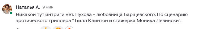 "Охране рыбовЪ" в комментариях к статье о том, что Мария Пухова- дочь Михаила Барщевского резонно указали, что Мария- не дочь. И никакой интриги, по словам комментатора, в этом нет. Мол, были же прецеденты с Биллом Клинтоном и некой стажерки в очень Белом Доме в Овальном кабинете Моники Левински. Комментатор- женщина. А женщинам - виднее. Они прозорливо смотрят и все видят. От них ничего не укроется. И делают свои выводы, исходя из своего опыта. Так что Пухова- это точно другая история Михаила Барщевского. А совпадение формы ушей и нахождение родинок там и там, где видно и не видно- обычное совпадение, подпадающее под теорию вероятности. А еще читатели надеются, что Пухова- не внебрачная дочь Евгения Теплякова.... А это уже третья история.... Желающие обсудить другую историю Марины Пуховой, и Михаила Барщевского, могут сделать это в комментариях.