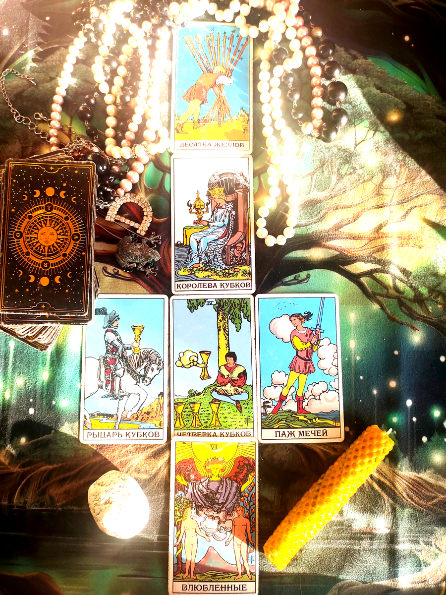 Ваша задача, не позволить тяжести обязанностей (10 Жезлов) и душевной усталости (4 Кубков) затмить ясность в момент главного выбора. Используйте свою эмоциональную мудрость (Королева Кубков) и аналитические способности (Паж Мечей), чтобы понять, какой путь ведёт к большей целостности и гармонии (Влюблённые). Помните, что иногда выбор, это не между плохим и хорошим, а между хорошим и вашим.
