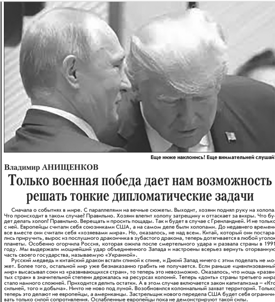 Что происходит в таком случае? Правильно. Хозяин влепит холопу затрещину и оттаскает за вихры. Что будет делать холоп? Правильно. Верещать и просить пощады. Так и будет в случае с Гренландией. И не только с ней. Европейцы считали себя союзниками США, а на самом деле были холопами. До недавнего времени все вместе они считали себя «хозяевами мира». Но оказалось, что не над всем. Китай, который они постарались приручить вырос из послушного дракончика в зубастого дракона, теперь дотягивается в любой уголок планеты. Особенно огорчила Россия, которая ожила после смертельного удара и развала страны в 1991 году. Мы выдержали мощнейший удар объединённого запада, и настроены всерьёз вернуть оторванную часть своего государства, называемую «украиной». Русский медведь и китайский дракон встали спиной к спине, и дикий запад ничего с этим поделать не может. Более того, остальной мир уже безнаказанно грабить не получается. Если раньше «цивилизованный мир» высасывал соки из «развивающихся стран», то те