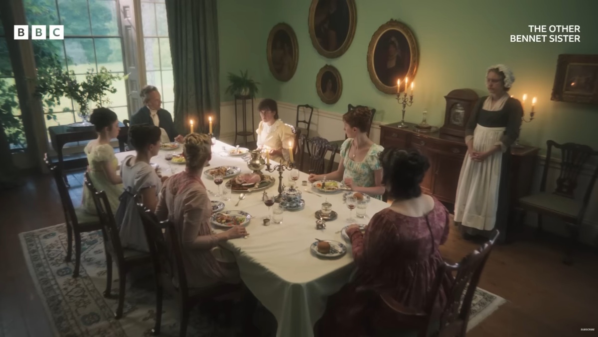 Вышел тизер к сериалу "Другая сестра Беннет" и я решила сначала написать пост, но как всегда сделала много скриншотов и поняла, что в пост все не поместятся. Посему предлагаю небольшую статью. В ролике изображено обед в семействе Беннетов, на которое Мэри впервые надела очки. За то, что это именно, обед говорит тот факт, что все дамы, кроме Мэри, в декольтированных платьях и на столе горят свечи в бокалах виднеется вино, несмотря что на улице довольно светло. Расположение стола живо напомнило мне сериал 1995 года, хотя обстановка и наряды показались мне несколько беднее. К счастью, мы видим скатерти, нормально сервированный стол (привет фильму 2005 года) и даже прислугу. Мистер Беннет сдержанно ироничен и противостоит жене. Миссис Беннет показалась не только глупой, но еще и несколько злобной. Дама где-то "потеряла" положенный ей по статусу чепчик, ну, или хоть что-то подобное на голове. Зато она единственная за столом носит украшения.Интересно, но не показалась, что Мэри внешне похо