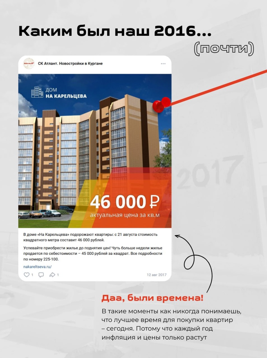 2016 😄 Шутим, конечно — возвращаться бы не хотелось (сколько всего поменялось!), а вот вспомнить можно. Пока в соцсетях вируситься тренд по фотографиям 10-летней давности, решили тоже стряхнуть пыль со своих архивов. Первые посты в наших соцсетях появились всего лишь на год позже. Поэтому решили собрать самые интересные и поделиться с вами. Смотрим, что строили, о чем писали и что важное удалось пронести сквозь года. В 2016-2017 годах мы только-только сдали жилые комплексы «На Мальцева» в Заозерном и «На Солнечном» на Бульваре, начали строить первую очередь «На Карельцева» и «Яркий». Именно тогда начался новый этап развития компании и большие перемены. На сегодняшний день строительная компания «Атлант» — это 225 424 м² или 22 сданных дома в разных районах Кургана, в которых живут почти 7 000 счастливых жильцов. Строим, растем, меняемся. Формируем новый облик города и качество жизни.