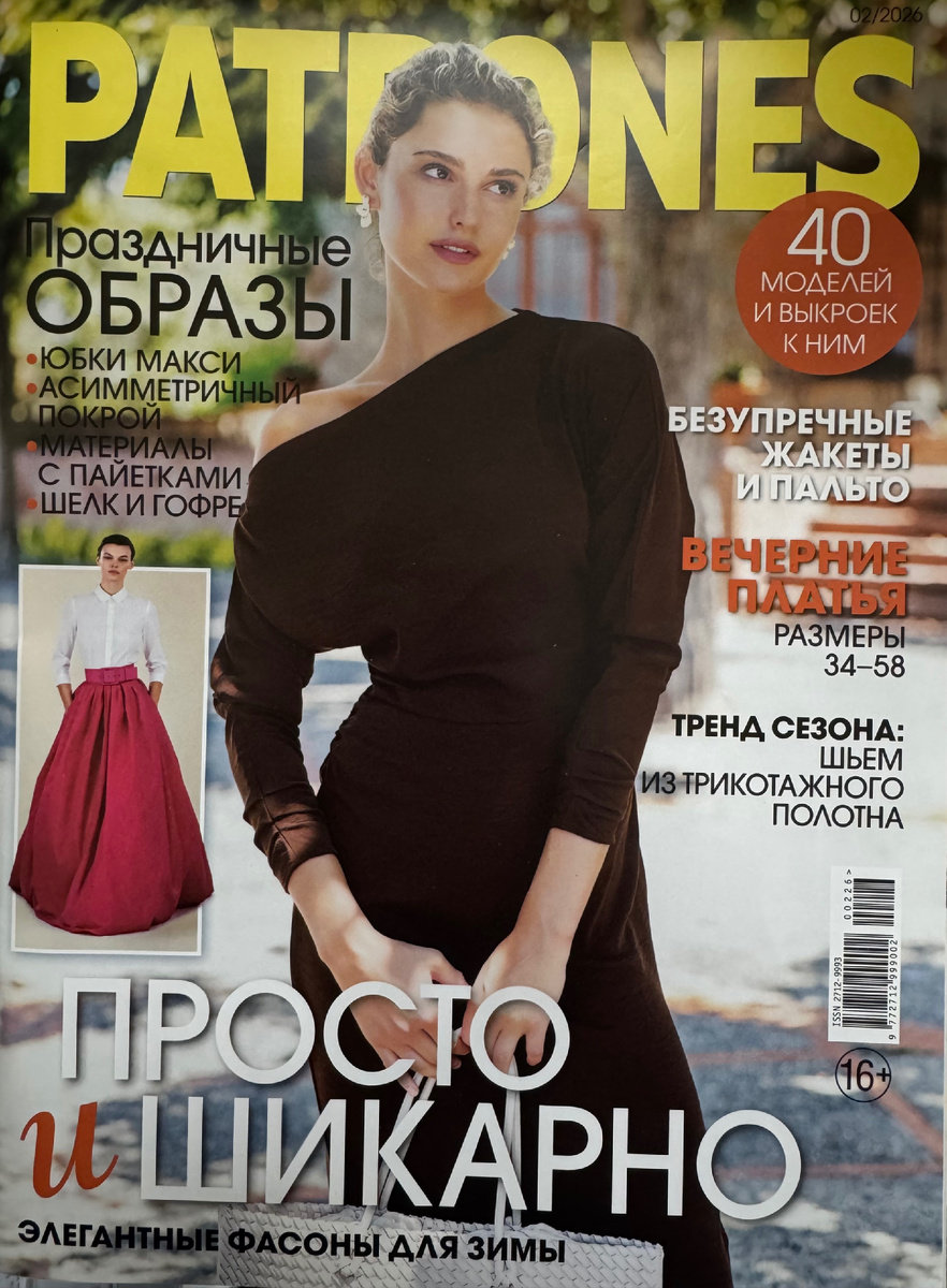 Февральский Patrones 2/2026: пальто, платья и трикотаж, ради которых хочется быстрее к машинке. Февральский Patrones в этом году вышел под лозунгом «Верхняя одежда», и тут легко обмануться. Листаешь журнал: пальто, пальто, ещё пальто… Кажется, что всё одно и то же. Но как только переворачиваем страницу на технические рисунки, начинается самое интересное. Там уже не ещё одно пальто, а куча вариантов: однобортные и двубортные, разного объёма - от аккуратного по фигуре до оверсайза, варианты демисезон и потеплее, из шерсти, твида и даже с мехом. То есть это тот случай, когда сохранить номер «на потом» ради верхней одежды, более чем логично. Но, если честно, моё сердце в этом выпуске украли не пальто, а дизайнерские платья. Номер можно смело прятать на будущее, например, к следующему Новому году. Дизайнерские платья в этом выпуске настолько нарядные, что они идеально вписываются в новогодний образ. Общее у них одно: асимметрия, драпировка, игра с линией плеча и вырезом. Отдельно отмечу чёр