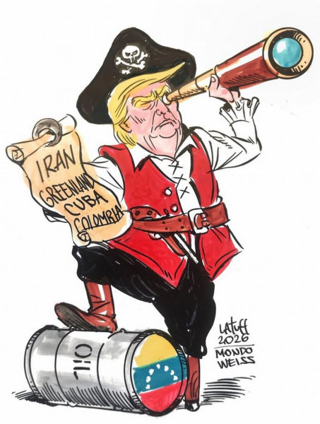 Рисунок Карлоса Латуффа (Бразилия). В списке пирата Трампа, поставившего ногу на бочку с нефтью, Иран, Гренландия, Куба, Колумбия...
