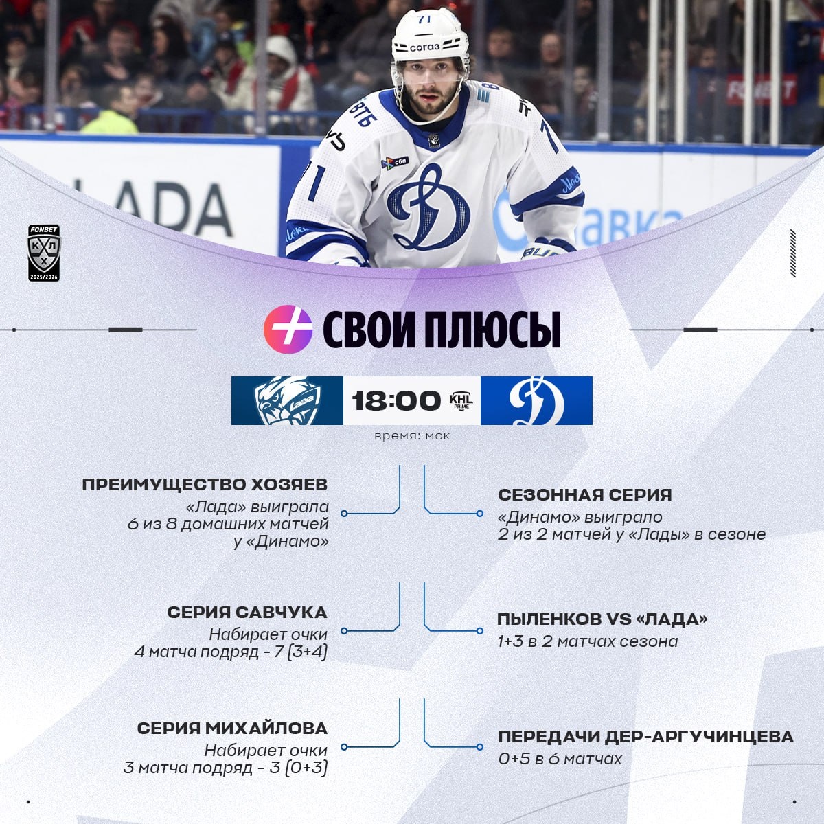 Серии Савчука и Михайлова 🚙, передачи Дер-Аргучинцева 🔵 — у каждой команды есть Свои Плюсы. Представляем ключевые на игру вечера пятницы.