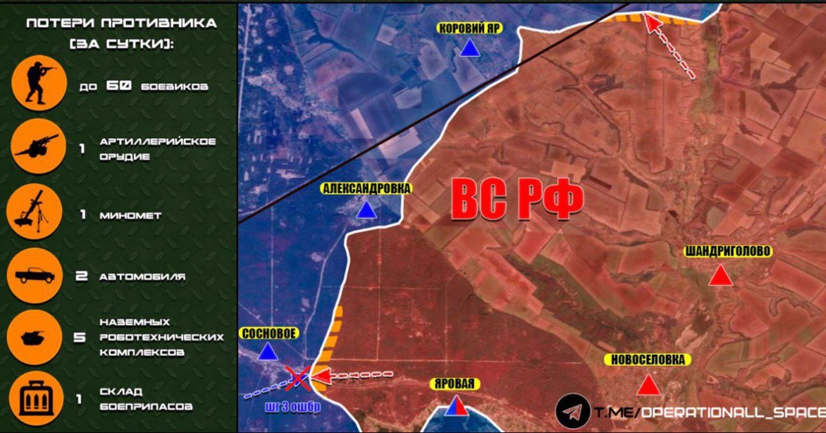 ⚡️ На Рубцовском направлении ВС РФ продолжают наступление на рубеже населённых пунктов Коровий Яр – Александровка – Сосновое