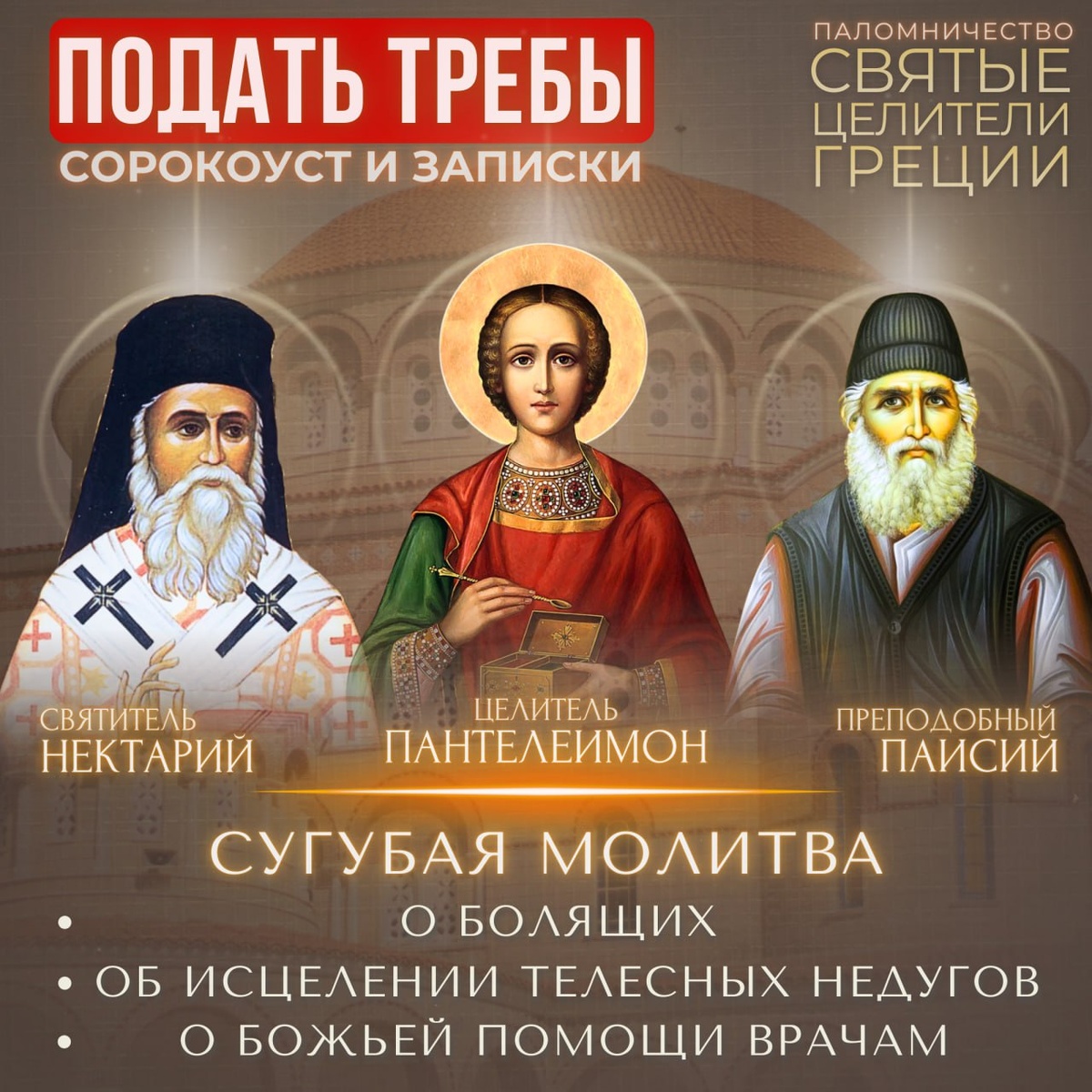 сугубая молитва за болящих ⬅️ назад Дорогие братья и сестры! Начинается паломничество, в ходе которого мы посетим святыни, у которых 🙏 сугубо молятся: — за болящих — об исцелении телесных недугов — о Божией помощи врачам ✍️ Подать записки можно на сайте: 👉 spyridon-rimini.ru/treba ____ 📌Все имена, поданные на сорокоуст, будут помянуты во все дни паломничества 📌 Записки "В святом месте" будут однократно помянуты в один из дней соответственно расписанию 📌 Письма с просьбой или благодарностью будут оставлены у мощей святых соответственно расписанию Расписание: - до 25 января 12.00 — у мощей Паисия Святогорца - до 27 января 12.00 — у мощей Николая Вуненского - до 28 января 12.00 — у мощей апостола Луки - до 29 января 12.00 — у мощей Иоанна Русского - до 30 января 12.00 — у мощей Ефрема Неа-Макринского - до 4 февраля 12.00 — у мощей Нектария Эгинского ____ Как подать записки: 👉 Инструкция — https://dzen.ru/media/id/66df18f592917607e836f50e/-zapiski-i-pojertvovaniia-68ac56c3a41a65