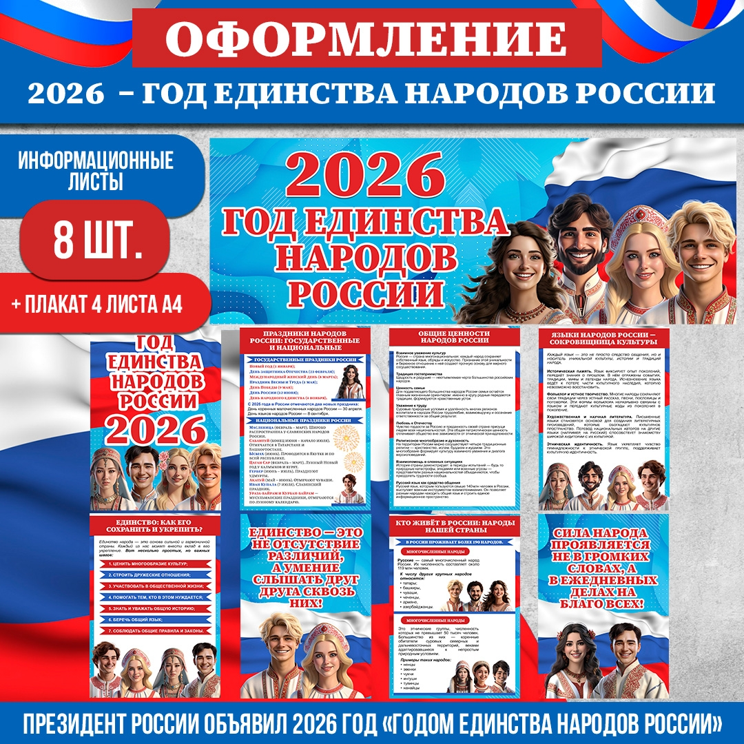 Президент РФ В. В. Путин подписал решение об объявлении 2026 года Годом единства народов России. В течение года по всей России пройдут фестивали, выставки, образовательные акции и культурные марафоны. Участники смогут познакомиться с национальными обычаями, музыкой, костюмами и ремёслами, ощутить богатство многонациональной культуры нашей страны. 👉 Что входит в данный комплект для оформления пространства школ, детских садов, библиотек и культурных центров: 8 тематических информационных листов: ✅ Год единства народов России; ✅ Общие ценности народов России; ✅ Кто живёт в России: народы нашей страны; ✅ Праздники народов России: государственные и национальные; ✅ Единство: как его сохранить и укрепить? ✅ Языки народов России – сокровищница культуры; ✅ Единство – это не отсутствие различий … ✅ Дела на благо всех ... ✅ Плакат баннер «2026 — Год единства народов России». Версия на 4 листах А4 (вертикальная компоновка). Почему стоит использовать этот комплект 📄Экономия времени. Не нужно иск