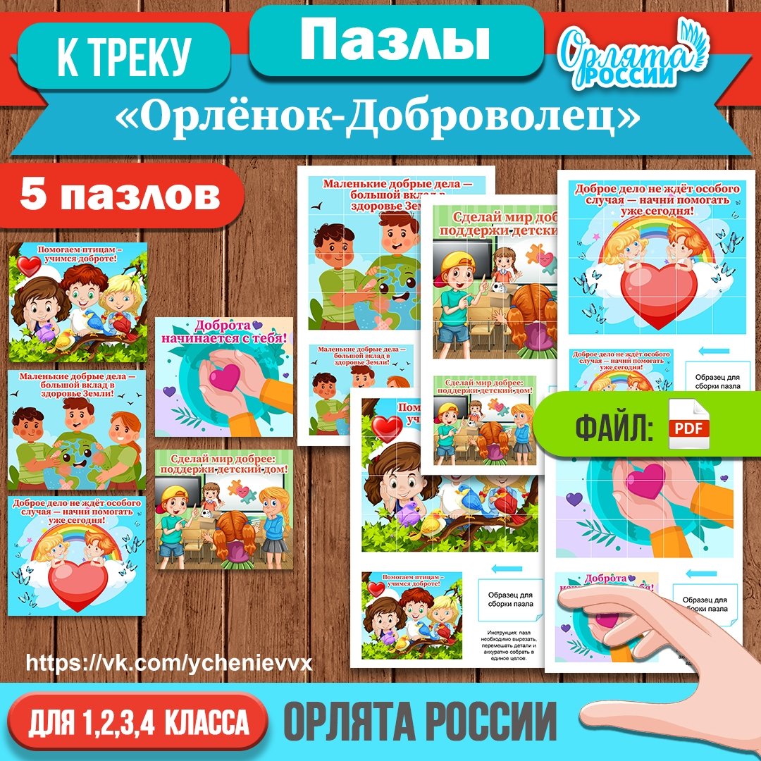 Хотите разнообразить занятия по треку «Орлёнок Доброволец»? Предлагаю комплект из 5 красочных пазлов с актуальными тематическими изображениями и фразами! 👉 Для кого: ученики 1–4 классов и дошколята (программа «Орлята России» и «Орлята-Дошколята»). 👉 Что в комплекте: PDF-файл для печати. 👉 Как использовать: ✅ индивидуально (по пазлу на ребёнка); ✅ парно (один пазл на парту); ✅ в формате командной игры на скорость. Сборка пазлов — не только развлечение: это повод поговорить о добровольчестве, чистоте городов, посёлков, морей, океанов и роли волонтёров. ❗❗ Скачать данный материал МОЖНО ЗДЕСЬ ❗❗ -------------------------------------------------- АВТОР «Учение»: материалы к урокам от ВВХ © #орлятароссии #материалыдляучителей #начальныеклассы #орленокдоброволец #орлёнокдоброволецпазлы #внеурочнаядеятельность #трекорленокдоброволец #пазлы #трекорлёнокдоброволец #начальнаяшкола
