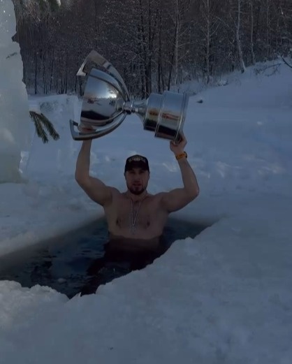 Хоккеист из Уфы Никита Щитов искупался в проруби вместе с кубком КХЛ 3х3