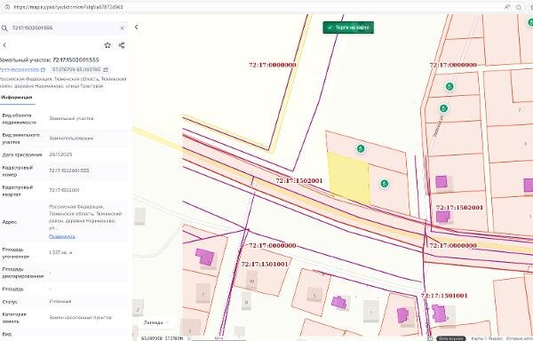; - кадастровый номер – 72:17:1502001:555; - площадь – 1 337 кв.м; - разрешенное использование – для индивидуального жилищного строительства; - категория земель – земли населенных пунктов; - территориальная зона – зона застройки индивидуальными жилыми домами (Ж1) Канал: Госземля Тюменская область Область: обл Тюменская Район: м.р-н Тюменский Населенный пункт: с.п. Наримановское, д Нариманова, ул Трактовая Локация: Смотреть на карте ВРИ: Для индивидуального жилищного строительства Кадастровый номер: 72:17:1502001:555 Кадастровая стоимость: - Вид сделки: Аренда Площадь: 1337 м² Начальная цена: 100983.00 руб. Дата завершения: 10.02.2026 Подробнее: ГИС ТОРГИ #госземля #земляотгосударства #земля #земельныйучасток #земельныеторги #торги #аукцион #арендаземли #аренда #тюменскаяобласть