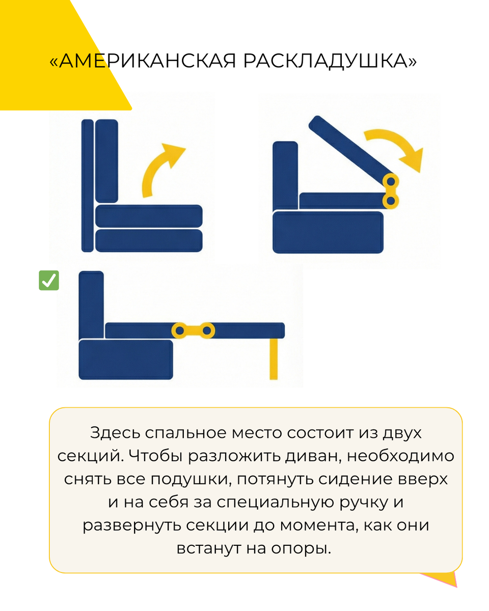 «Американская раскладушка» Плюсы: надёжный механизм из прочных материалов. Спальное место ровное, без сильных заломов, за счёт усиленного металлического каркаса и сетки. Подходит для матрасов толщиной до 12 см, поэтому на таком диване комфортно спать. Минусы: отсутствует бельевой ящик, на поверхности могут ощущаться швы. «Дельфин» Плюсы: крепкая и долговечная конструкция. В разложенном виде получается большое спальное место, предусмотрен вместительный ящик для белья.