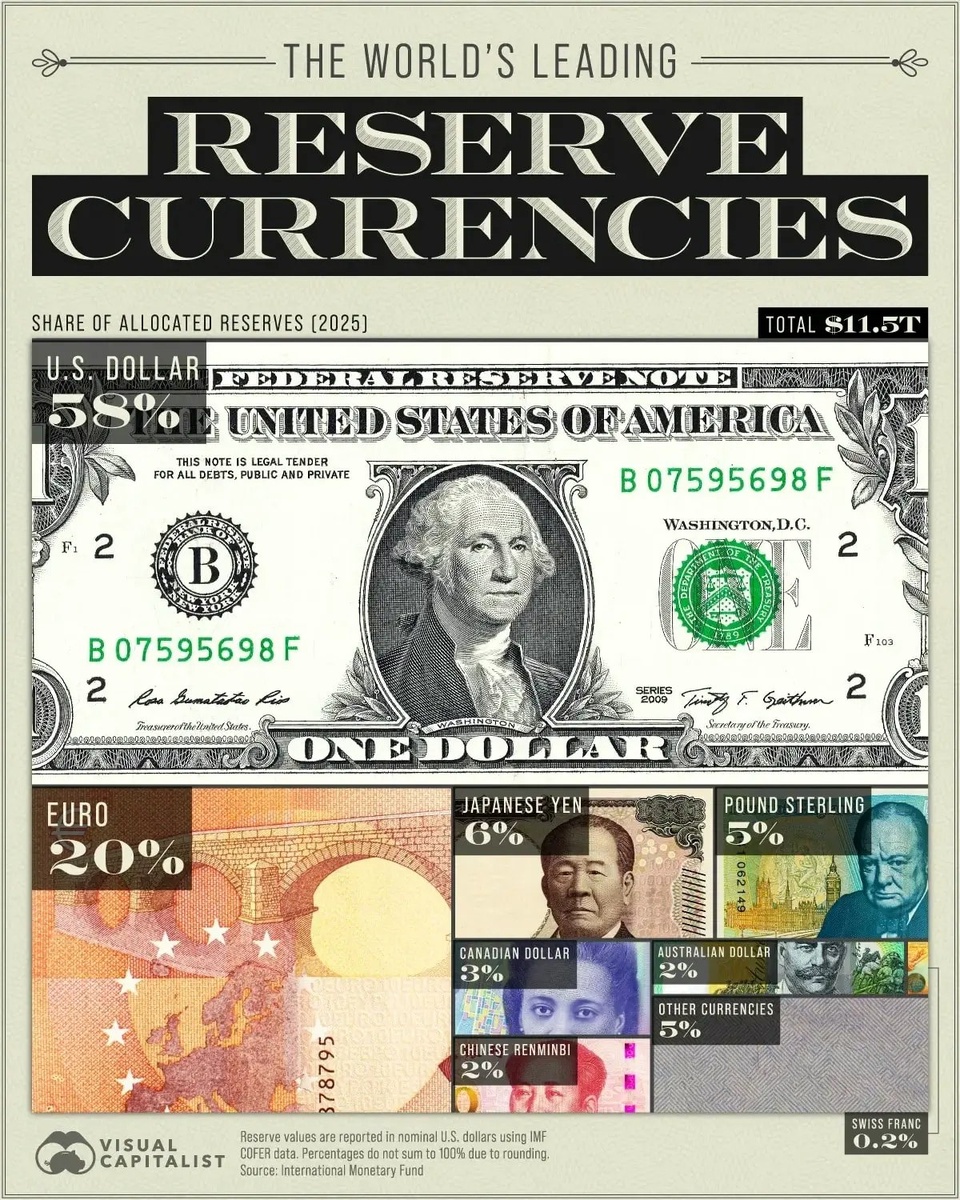 Король валют – доллар США, – крепко держит корону, заграбастав кучу мировых резервов. Евро тоже не отстает, обживаясь на втором месте. Остальные валюты, типа фунтика и юаня, тоже пытаются урвать свой кусок пирога. Все это нужно, чтобы страны могли спокойно торговать, платить по долгам и не переживать за курс своей родной монетки. 📰 Читать тут: signaldaily.ru 🏞 Автор изображения: naked-science.ru 📣 Присоединяйтесь: sgnaldaily