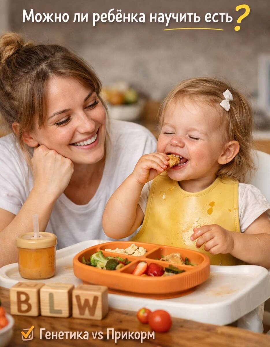 5 м. + отличный аппетит) — живая иллюстрация того, что правильный подход к прикорму действительно может повлиять на отношение ребёнка к еде. Но давайте разберём всё чуть глубже — на что влияет генетика, а что может дать прикорм и схема его введения. 🧬 Что говорит наука о генетике аппетита? Исследования с близнецами показывают, что такие вещи, как привычки к еде и избирательность в продуктах, сильно зависят от генетики. В одном большом исследовании генетические различия объясняли примерно 60 % различий в том, насколько дети привередливы в 16 месяцев, и до 74 % к 13 годам — то есть у многих детей склонность к еде действительно «вшита» в них самой природой. Но это не значит, что всё решено навсегда — средовые факторы тоже работают, особенно в раннем возрасте. А как влияет способ введения прикорма? Методы прикорма, особенно BLW (baby-led weaning) — когда ребёнок сам берет пищу и исследует её — связаны с рядом положительных моментов: 🍭Дети, которых прикармливали по BLW, реже проявляют