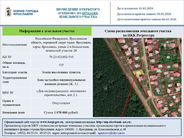 участок 26 Канал: Госземля Ярославская область Область: обл Ярославская Район: г.о. город Ярославль Населенный пункт: г Ярославль улица 2-я Больничная, земельный участок 26 Локация: Смотреть на карте ВРИ: Для индивидуального жилищного строительства Кадастровый номер: 76:23:021402:510 Кадастровая стоимость: - Вид сделки: Продажа Площадь: 415 м² Начальная цена: 1078000.00 руб. Дата завершения: 06.02.2026 Подробнее: ГИС ТОРГИ #госземля #земляотгосударства #земля #земельныйучасток #земельныеторги #торги #аукцион #продажаземли #продажа #ярославскаяобласть