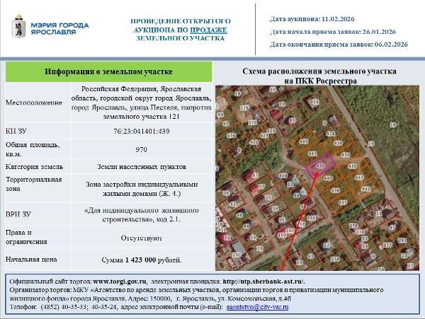 участка 121 Канал: Госземля Ярославская область Область: обл Ярославская Район: г.о. город Ярославль Населенный пункт: г Ярославль улица Пестеля, напротив земельного участка 121 Локация: Смотреть на карте ВРИ: Для индивидуального жилищного строительства Кадастровый номер: 76:23:041401:439 Кадастровая стоимость: - Вид сделки: Продажа Площадь: 970 м² Начальная цена: 1423000.00 руб. Дата завершения: 06.02.2026 Подробнее: ГИС ТОРГИ #госземля #земляотгосударства #земля #земельныйучасток #земельныеторги #торги #аукцион #продажаземли #продажа #ярославскаяобласть