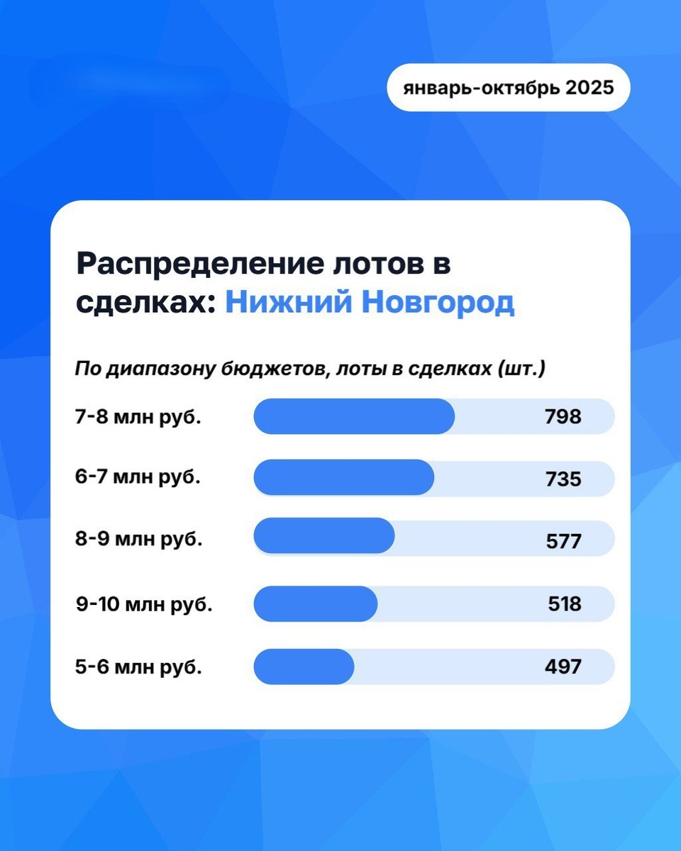 ? 🟧 📈 Наибольший интерес в Нижнем Новгороде сосредоточен в ценовом диапазоне от 6 до 9 млн рублей. В городе абсолютным лидером стал сегмент 7-8 млн руб. — (798 шт. лотов в сделках), затем — 6-7 млн (735 шт.), на третьем месте — 8-9 млн руб. (577 шт.). 🟧 В области ситуация схожая: максимальная активность зафиксирована в сегментах 6-7 млн (403 шт.) и 4-5 млн (400 шт.). Также востребован диапазон 5-6 млн (301 шт.). 🟧 А вот жилье стоимостью свыше 15 млн остается нишевым продуктом с минимальным объемом сделок, что отражает реальную покупательную способность региона. Анализ лотов в сделках с января по октябрь 2025 года показывает предсказуемую ситуацию — покупатели предпочитают бюджетные лоты. #аналитика #статистика #нижнийновгород