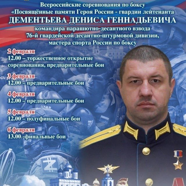 Со 2 по 6 февраля Псков примет Всероссийские соревнования по боксу, посвященные памяти Героя России, гвардии лейтенанта Дениса Геннадьевича Дементьева. Денис Дементьев был не только отважным офицером, командиром парашютно-десантного взвода 76-й гвардейской десантно-штурмовой дивизии, но и выдающимся спортсменом — мастером спорта России по боксу. Программа соревнований: • 2 февраля (12:00) — торжественное открытие и старт предварительных боев; • 3–4 февраля (12:00) — предварительные поединки; • 5 февраля (12:00) — полуфинальные бои; • 6 февраля (13:00) — финальные встречи и награждение победителей. Турнир соберет сильнейших боксеров страны, чтобы почтить память героя и продемонстрировать волю к победе — качества, которыми всегда отличался Денис Дементьев.