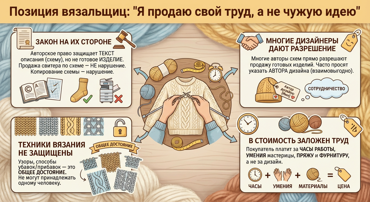 Вопрос о праве вязальщиц зарабатывать на изделиях, связанных по чужим схемам, является одним из самых спорных и эмоциональных в сообществе рукодельниц. Он обнажает конфликт между трудом, творчеством и авторским правом, и у каждой стороны есть свои веские аргументы. Вязальщицы, продающие изделия, связанные по чужим описаниям, как правило, опираются на следующие доводы: Дизайнеры, в свою очередь, испытывают праведный гнев, видя, как на их творчестве зарабатывают другие. Их аргументы таковы: Между этими двумя полярными мнениями существует и "серая зона": В конечном счете, этот конфликт — столкновение юридических норм, этических представлений и бизнес-интересов. Ясность в этом вопросе могут внести сами дизайнеры, четко прописывая условия использования своих схем. А вязальщицам, в свою очередь, стоит с уважением относиться к чужому творческому труду и всегда стремиться к диалогу с авторами.