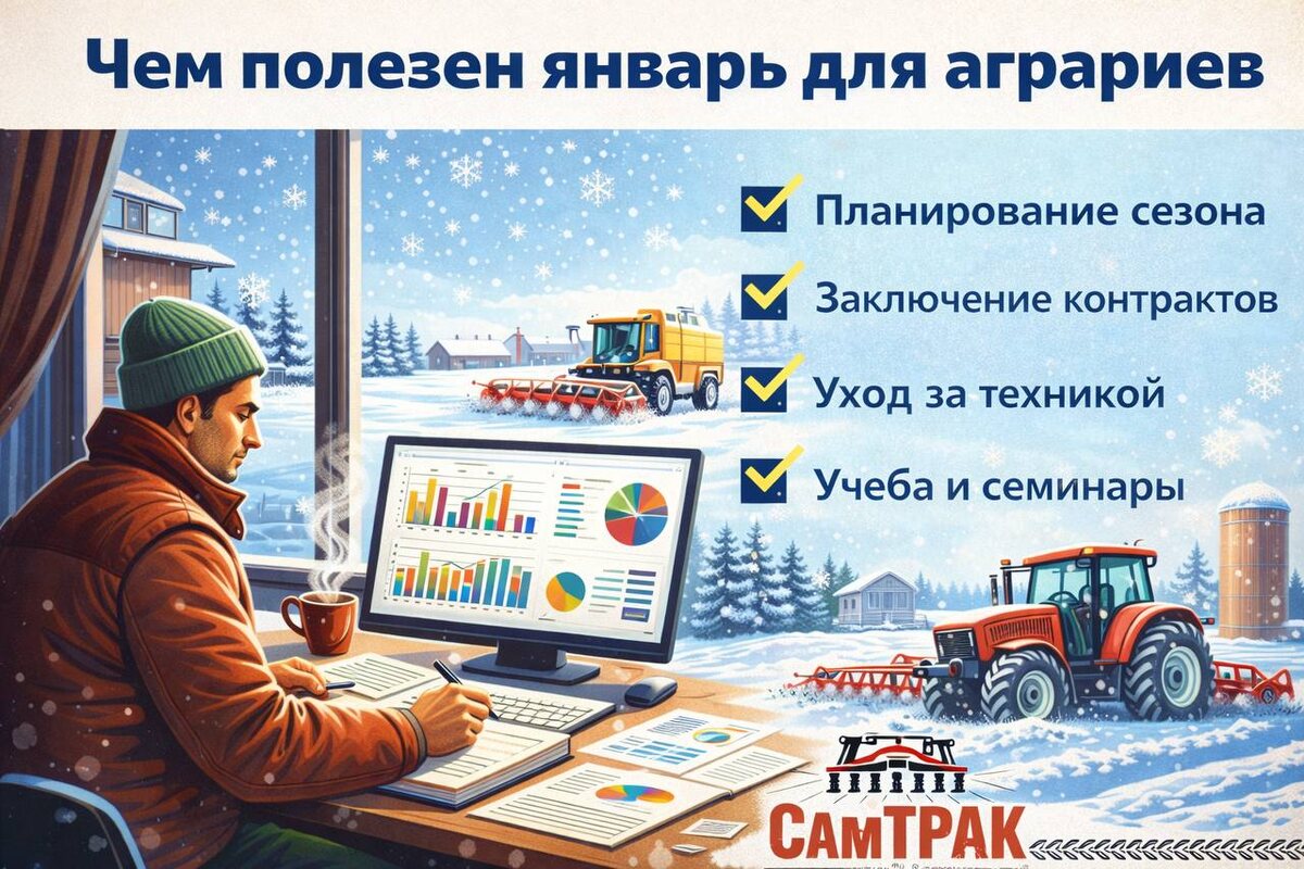 Январь — ключевой месяц, который напрямую влияет на результат всего сезона. Именно сейчас закладывается эффективность весенних и летних работ. - Точное планирование сезона Спокойный период без авралов позволяет рассчитать загрузку техники, определить узкие места и заранее выбрать оптимальные решения под ваши площади и задачи. - Выгодные условия на технику и сервис Зимой проще подобрать технику, обсудить комплектацию, условия поставки и сервисного обслуживания — без сезонного ажиотажа и с лучшими условиями. - Подготовка техники без простоев Плановое ТО и ремонт в январе — это экономия времени и денег весной, когда каждый день в поле в сезон на вес золота. - Обучение и повышение эффективности Разбор технологий, консультации со специалистами и обучение персонала позволяют повысить отдачу от техники уже в новом сезоне. Итог: Кто грамотно использует январь — работает спокойнее, быстрее и прибыльнее весь год. СамТРАК помогает аграриям подготовиться к сезону: подбор техники, дефектовка, серви