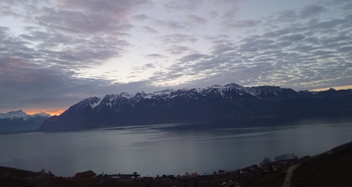 Сначала, до Монтрё, дорога идет вдоль Женевсккого озера (озеро Леман), и виды совершенно сказочные - солнцe показывается из-за гор, и озеро постепенно светлеет, пока не станет небесно-голубым.
