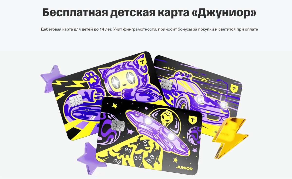 Детская дебетовая карта «Джуниор» — это банковский продукт Т-Банка (ранее Tinkoff Bank), ориентированный на детей и подростков до 14 лет. Она создана для безопасного использования карманных денег, обучения финансовой грамотности и удобного контроля со стороны родителей.