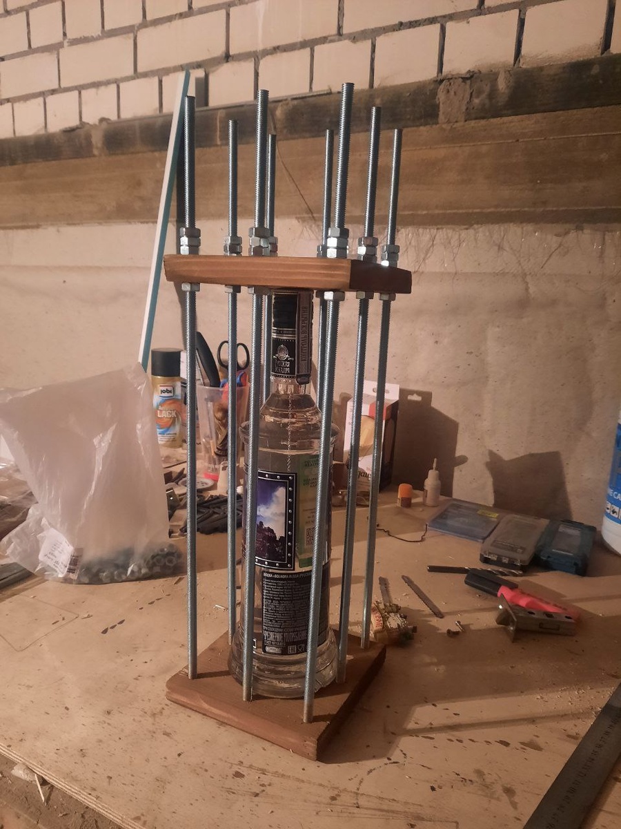 Пригласил меня однажды на День Рождения дорогой друг. Конечно обрадовался, ведь по мимо праздничного застолья намечалась еще и баня с вениками. А это уже прям торжество души. Встала задача, а что же все-таки подарить? Просто конверт, уже банально, что-то для его увлечений... так у него есть все от удочки до мотособаки. Думал, думал и решил, что а сделаю-ка я ему головоломку. И тем более после такого застолья наверняка понадобится, ну или просто в коллекцию поставит. Съездил в магазин, купил красивую бутылку горячительного сорокоградусного напитка, пару запчастей к подарку: шпильки, гайки, шайбы и начал изготовление. В цоколе нашел пару досок, запилил их в размер, обработал срезанные торцы шлифмашинкой, чтобы заноз не наставить. Затем обработал какой-то морилкой, ну чтобы цвет придать изделию. Просверлил несколько дырок, вставил туда шпильки. С обратной стороны дна, с помощью сверла-пера сделал углубление в размер шайбы, и закрепил шпильки на гайки. Затем капнул немного супер клея, что