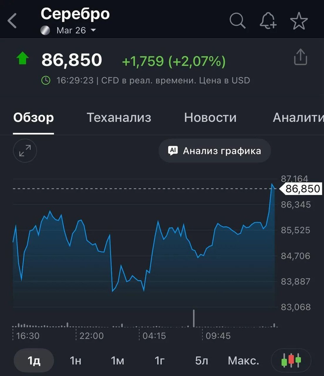 Серебро обновило исторический максимум и превысило $87 за унцию: с начала года цена металла выросла почти на 25%.