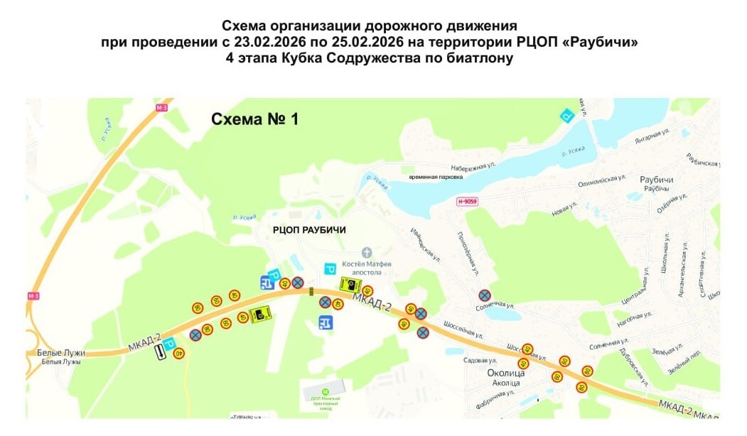 В спорткомплексе «Раубичи» 23—25 января пройдёт IV этап Международных соревнований по биатлону «Кубок Содружества». Как будет организовано движение в окрестностях спортивного объекта, рассказали в УВД Миноблисполкома. Схемы здесь и ниже: t.me/minobl_uvd В связи с планируемым массовым посещением праздника «Минская лыжня — 2025» ожидается плотный транспортный поток. ГАИ советует совершать поездки на данное мероприятие на общественном транспорте. В целях обеспечения безопасности дорожного движения на 10—13-м километрах автодороги Р-80 Слобода — Паперня, а также на 7—10-м километрах трассы Р-40 Боровляны — Логойск будут введены временные ограничения максимальной скорости движения транспортных средств (до 50 км/ч). Парковка личного транспорта предусмотрена вблизи РЦОП «Раубичи». Госавтоинспекция Минской области рекомендует автовладельцам планировать время и маршрут поездок с учётом предоставленной информации, строго выполнять требования временных дорожных знаков и сигналов регулировщиков до