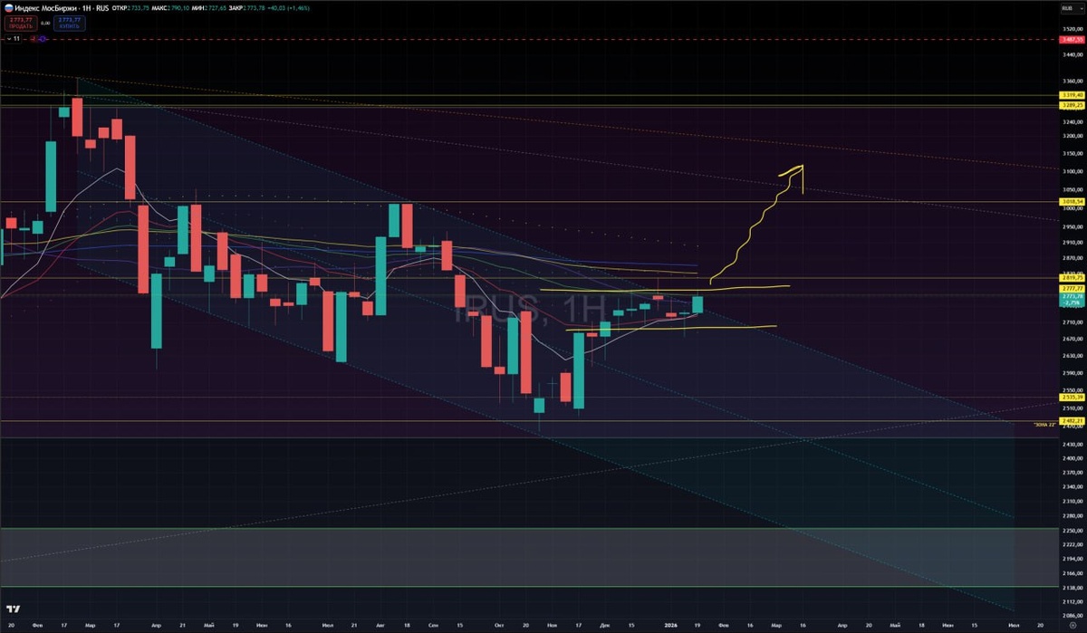 Вместо эфира, я несколько кратких постов сделаю на темы, которые накопились. Сначала про рынок. На данный момент жду закрытие недели. Если оно состоится на текущих и выше, то мы впервые за последние 12 месяцев делаем попытку выхода из нисходящего тренда. В свою очередь, выход наверх сигнализирует о том, что накопление, которое длится уже более 6 недель контролируется покупателем. Выход из такого накопления должен быть энергичным. Предварительно, если рассматривать выход наверх, то это около 10-15% роста "должно" быть. По уровням - это диапазон 3000-3100. Здесь еще хочу подчеркнуть некоторую особенность, о которой давно знают в 777. Сейчас картина в индексе - это ооочень усредненный показатель. Он сейчас накапливается (если предположить рост) не за счет привычных крупных Газпром, Сбер и Лукойл, а за счет более широкого пула бумаг, входящих в индекс. Поэтому если ставить на рост, то для этого я бы избегал эти 3 компании. И в принципе нефтянку, если смотреть более широко. Конкретн