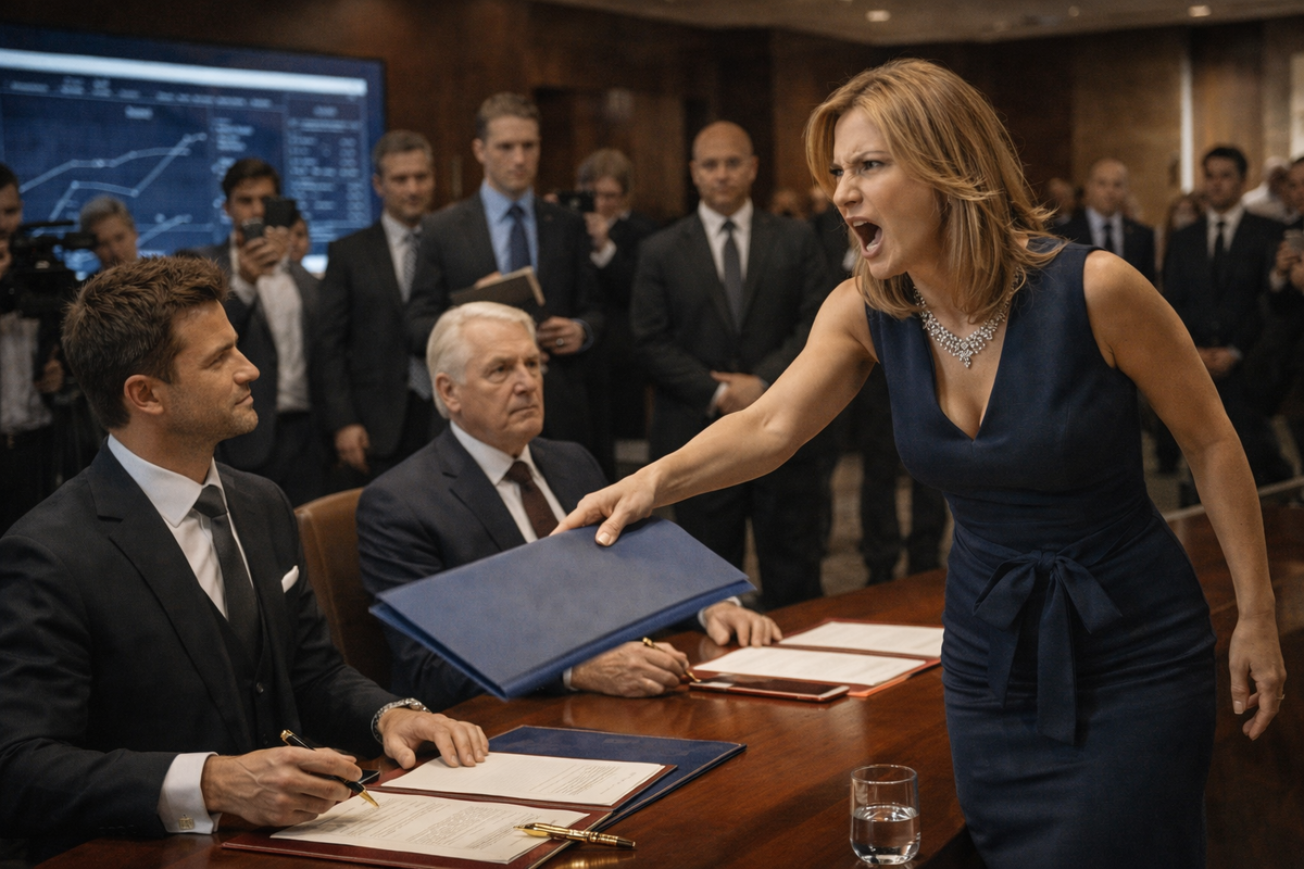 Матвей застывает, его перо застыло в сантиметре от бумаги. Замирает и его партнёр. Все присутствующие, как по команде, поворачивают головы к неожиданно ворвавшейся сестре олигарха. Она, поймав на себе всеобщее внимание и явно наслаждаясь этим моментом, быстрыми, звонкими шагами проходит к столику для подписания, решительно отстраняет одного из замерших в нерешительности помощников и встаёт в самый центр, между Воронцовым и его ошеломлённым визави. Затем, высоко подняв свою синюю папку, она громко, на весь зал, провозглашает: