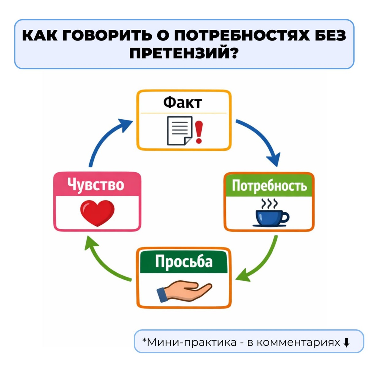 ? Почему «нормальная просьба» часто звучит как претензия? Потому что в речи смешиваются 3 вещи: 1. факт 2. оценка 3. обида Пример: «Ты вообще никогда меня не поддерживаешь». Это не факт. Это оценка. И партнёр слышит нападение. Правило, которое снижает напряжение 1. Факт (что случилось) 2. Чувство (что я переживаю) 3. Потребность (что для меня важно) 4. Просьба (что конкретно можно сделать) Маршалл Розенберг формулировал это очень точно: По-человечески: за резкостью часто стоит важная потребность, которую не получилось сказать прямо. 📌 Готовые фразы, которые звучат по-взрослому Вместо претензии: «Тебе всё равно». ➖Так: «Мне важно чувствовать поддержку. Можешь сегодня 10 минут просто послушать меня без советов?» Вместо учителя: «ты должен понимать». ➖Так: «Я хочу договориться. Для меня это про уважение и спокойствие». Вместо ярлыка: «Ты инфантильный». ➖Так: «Когда я делаю это одна, я устаю и злюсь. Давай распределим задачи». 💬Какую фразу вам сложнее всего говорить партнёру: про