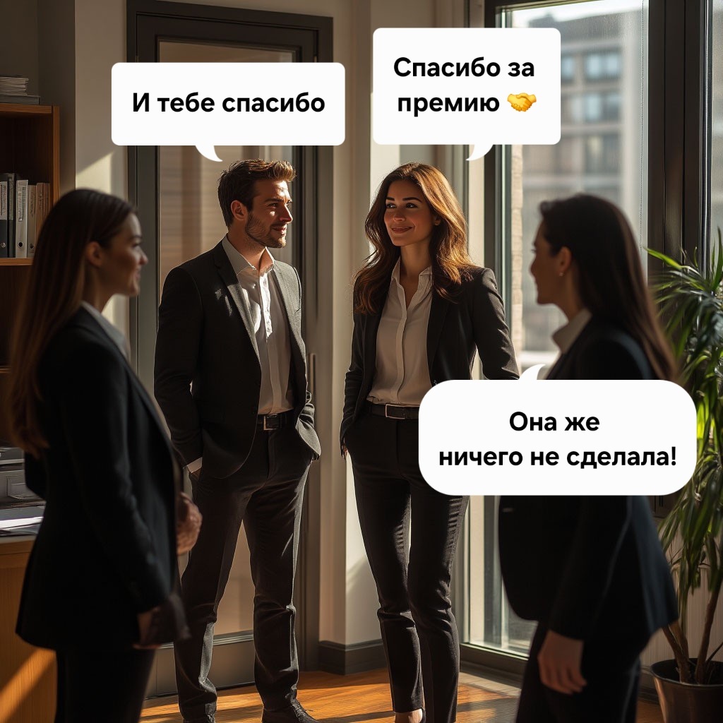 Наступило рабочее совещание, во время которого начальник объявил очередную премиальную выплату. Всем сотрудникам сообщили о распределении премий, отметив заслуги каждого сотрудника отдельно. Однако особенно выделили Марину, похвалив её инициативу и активность. Остальные сотрудники сидели молча, осознавая бесполезность собственных усилий.