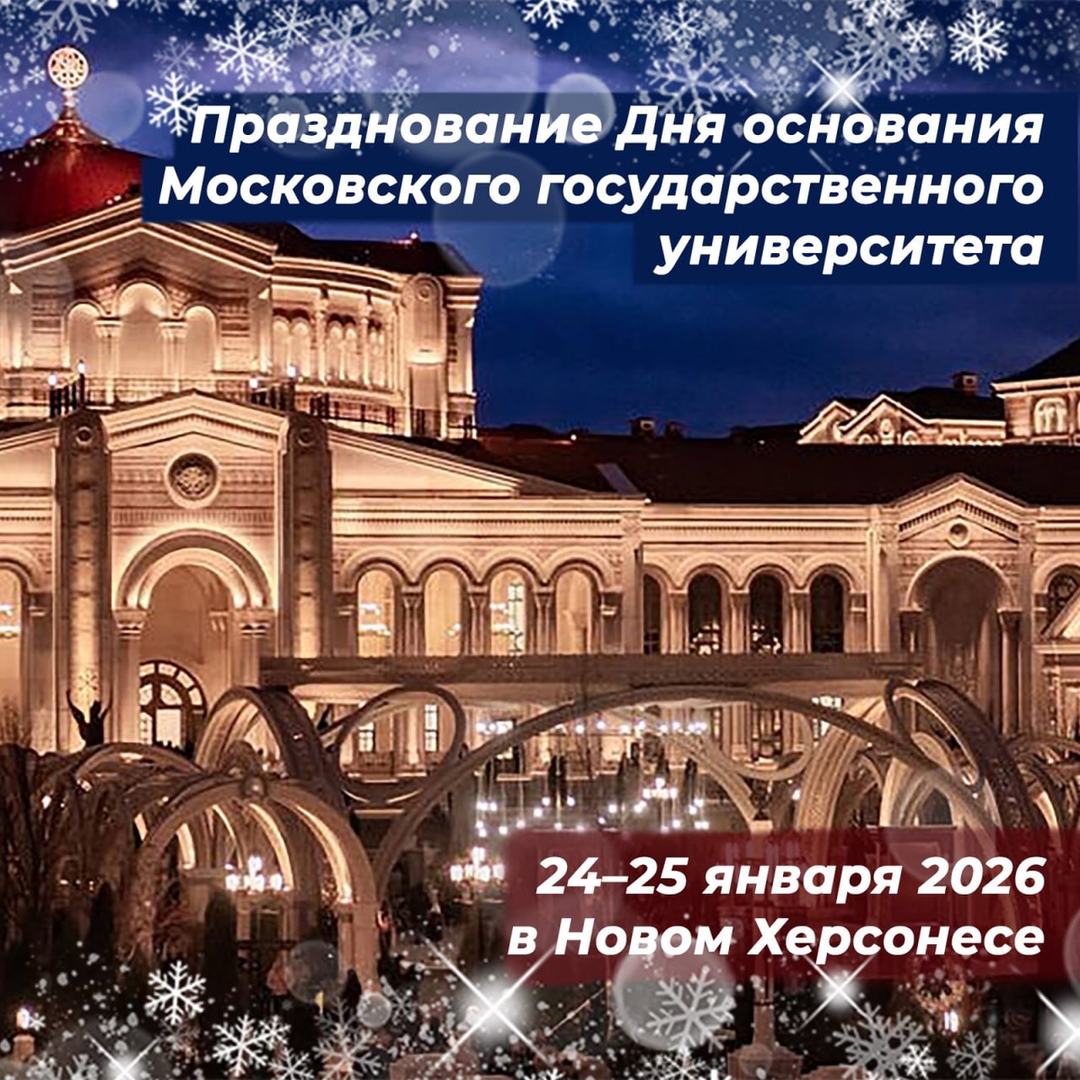 ! 🎉 На празднование Дня основания Московского университета, которое состоится 24-25 января 2026 года на территории историко-культурного парка «Новый Херсонес» приглашаются сотрудники и студенты Филиала МГУ в городе Севастополе! Сбор участников от Филиала: 24 января в 22:30 у Свято-Владимирского собора. 25 января в 15:45 для участия в интеллектуальной битве. Подробная программа прилагается. Будем рады видеть каждого из вас! Программа праздника: 🗓 24 января (суббота): ✨ 23:00 – Исповедь в Свято-Владимирском соборе. ✨ 23:30 – 01:30 – Ночная Божественная литургия. ✨ 01:30 – 02:00 – Крестный ход, молитва святой Татиане, праздничная трапеза. ✨ 02:30 – 07:00 Ночные активности в «Таверне 988» и молодёжном центре «Точка опоры»: караоке-викторина, музыкальная программа, общение, настольные игры. 🗓 25 января (воскресенье) актовый зал КДЦ Филиала: ✔️ в 10.00 состоится праздничный концерт Ансамбля песни и пляски Министерства обороны РФ. 🗓 25 января (воскресенье) "Новый Херсонес":