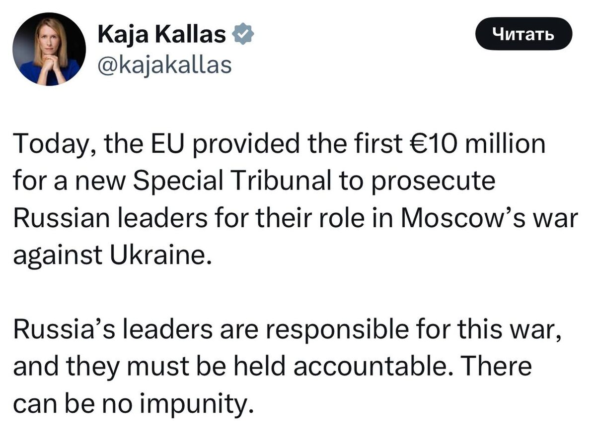 : Сегодня ЕС выделил первые 10 млн евро новому Специальному трибуналу для судебного преследования российских лидеров за их роль в войне Москвы против Украины Российские лидеры несут ответственность за эту войну, и они должны быть привлечены к ответственности. Не может быть никакой безнаказанности @geonrgru | YouTube | sponsr.ru