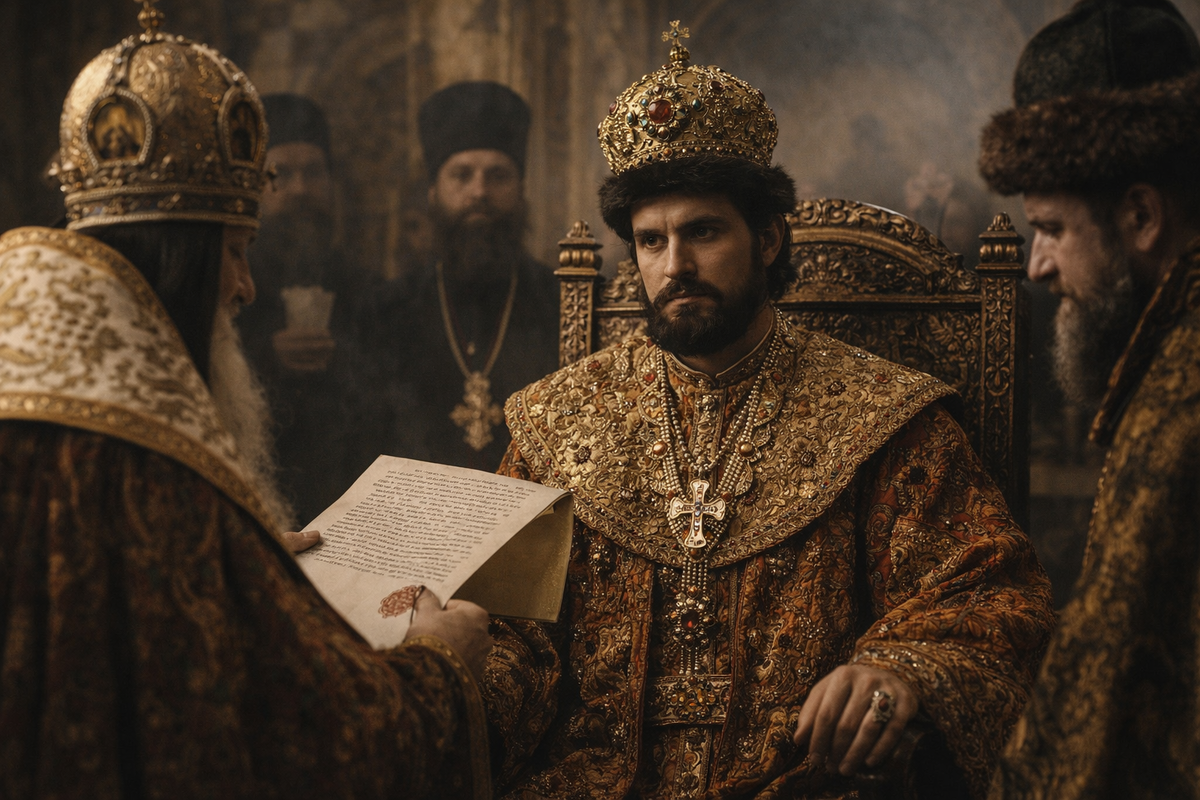 - Лжедмитрий I как легитимный монарх: Важно подчеркнуть, что в глазах элиты он был полноценным «венчанным царем». Процедура венчания в Успенском соборе прошла при участии высших иерархов (включая будущих патриархов Гермогена и Филарета). В своей административной практике он вел себя как традиционный православный государь: подтверждал монастырские грамоты, что заставляло институты власти признавать его законность.