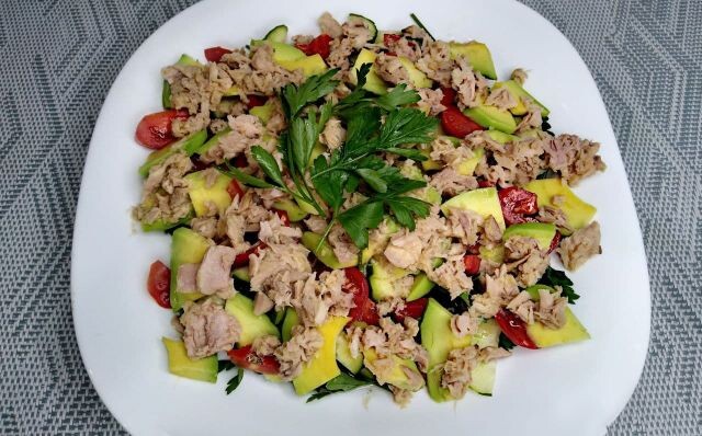 Этот салат — настоящая палочка-выручалочка. Готовится за 15 минут, выглядит достойно даже на праздничном столе, а вкус — нежный, свежий и сбалансированный. Отличный вариант, когда хочется чего-то легкого, но при этом сытного. Подойдет и для семейного ужина, и для гостей, и даже как полезный перекус. Яйца отвариваем вкрутую (примерно 8–9 минут после закипания). Затем охлаждаем, очищаем и нарезаем кубиками. Можно и натереть на крупной терке — салат получится более нежным. Открываем банку с консервами, сливаем лишнюю жидкость. Рыбу разминаем вилкой — без фанатизма, пусть остаются небольшие кусочки, так вкус будет интереснее. Авокадо разрезаем пополам, удаляем косточку и аккуратно снимаем кожуру. Нарезаем кубиками и сразу сбрызгиваем лимонным соком — так авокадо не потемнеет и сохранит свежий вкус. 💡 Совет: выбирайте мягкий, но не перезрелый авокадо — он должен слегка поддаваться при нажатии. Огурец нарезаем небольшими кубиками. Если кожура грубая — лучше очистить.
