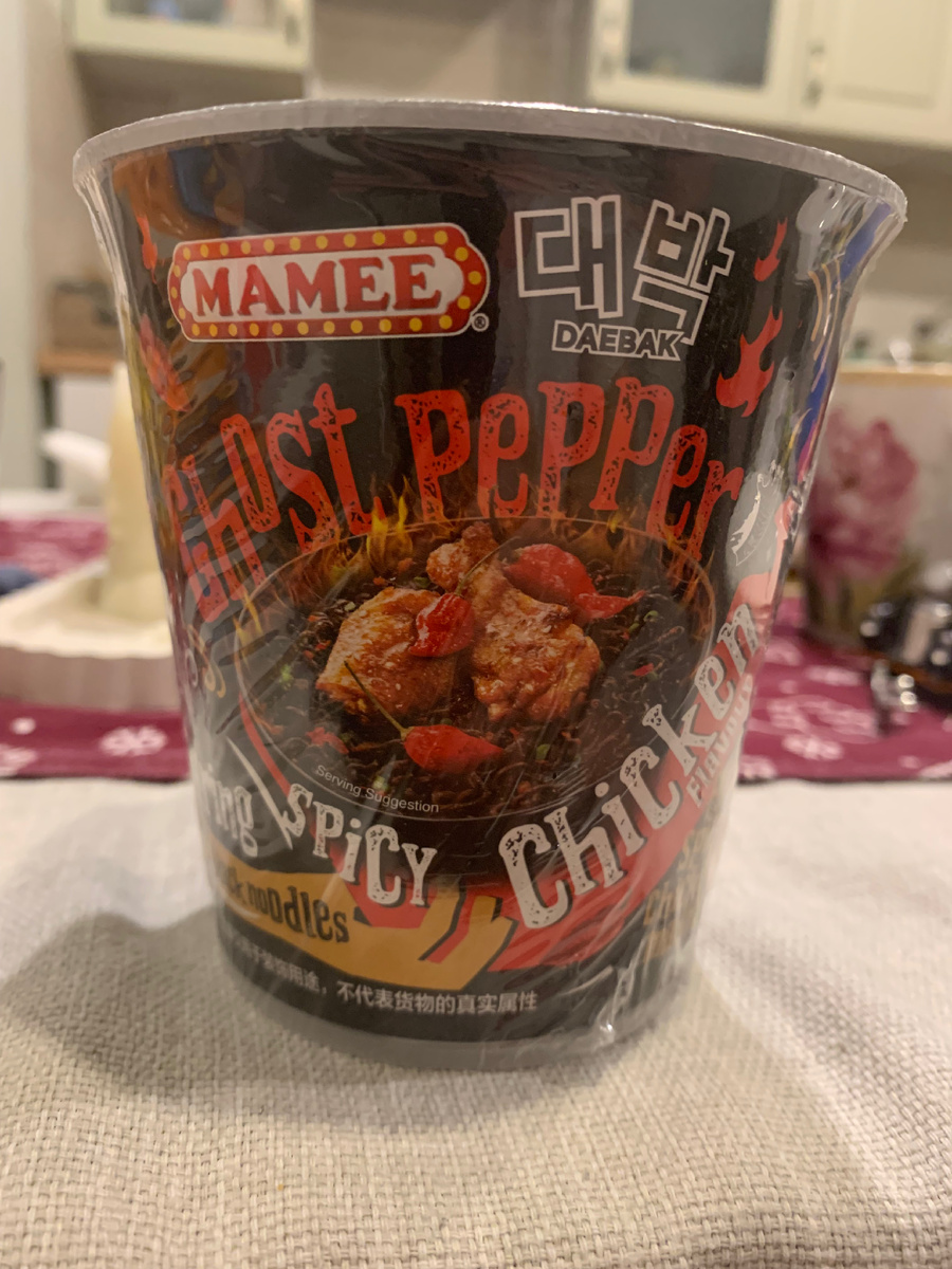 Черная, брутальная раскраска стакана кагбе намекает нам - берегись! На одной из сторон картинка, что тут содержится перец Призрак, мильон сковиллей, а все остальное - не для слабаков. И вообще, лапша для проведения челленджей. Смотрел я несколько роликов в интернете, где матерые азиаты падали от нее в обморок, давились соплями, и прочее. Ну, думаю, настало мое время.