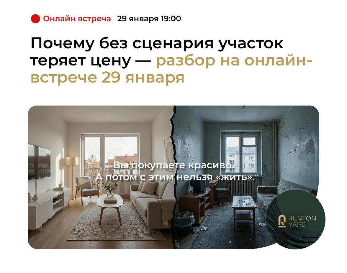 А главное — не проверяете… 💸 Представьте простую ситуацию. Вы снимаете квартиру. На фото — конфетка: ремонт, мебель, цена норм. Хозяин говорит уверенно: «Да всё ок. Заезжай. Бумаги потом, это формальность». Вы заезжаете. А потом выясняется: договора нет. соседи против, парковки нет, через месяц просят съехать Квартира была красивой. Но жить в ней нельзя. С землёй и коммерческой недвижимостью происходит то же самое. 🏗️ Участок может выглядеть перспективно: локация нравится, цена устраивает, цифры сходятся. И очень часто звучитит знакомое: «Потом решим», «у всех так», «это не проблема». Потому что главный риск — не в цене и не во внешнем виде. А в том, что до сделки не проверили, можно ли довести объект до результата... ⬇️⬇️⬇️ 🎯 29 января в 19:00, четверг проведём закрытую бесплатную онлайн-встречу: разберём, что проверять до покупки участка, и как не купить риск под видом актива. ⏳💰 🤖 Бесплатная регистрация — в боте по ссылке ниже. ⬇️⬇️⬇️ https://t.me/Renton_Yard_bot ———