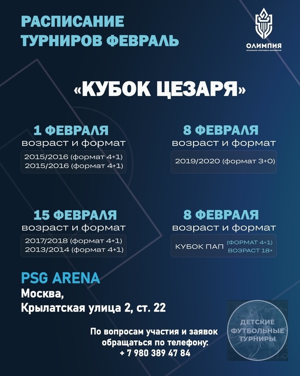 " 🏆 Публикуем полное расписание на предстоящий месяц ⬇️ ❗️1 ФЕВРАЛЯ ⚡️2015/2016 года рождения - средний уровень ⚡️2015/2016 года рождения - начальный уровень ❗️8 ФЕВРАЛЯ ⚡️2019/2020 года рождения ⚡️КУБОК ПАП +18 ❗️15 ФЕВРАЛЯ ⚡️2017/2018 года рождения ⚡️2013/2014 года рождения Для получения более подробной информации обращаться по телефону 📲 89803894784 Максим. Что вас ждет на турнире? 🏅 Награждается каждый участник игр! Обновленные награды, уникальные медали, новые номинации и многое другое ждет ребят на турнирах! 🔝Лучшие игроки награждаются памятной медалью, а так же подарком от нашей организации ⚽️ Игры проходят одновременно на двух полях, что снижает паузы между играми 🕰 Минимальное игровое время на команду 60 минут (это то, что вы точно получите на турнире) 🏟Игры проходят в ТОПОВОМ футбольным манеже Москвы! 📸 На каждом турнире работает фотограф, который сможет сделать снимки лучших моментов игр и награждения! Так же каждый турнир проходит с музыкальным сопровожде