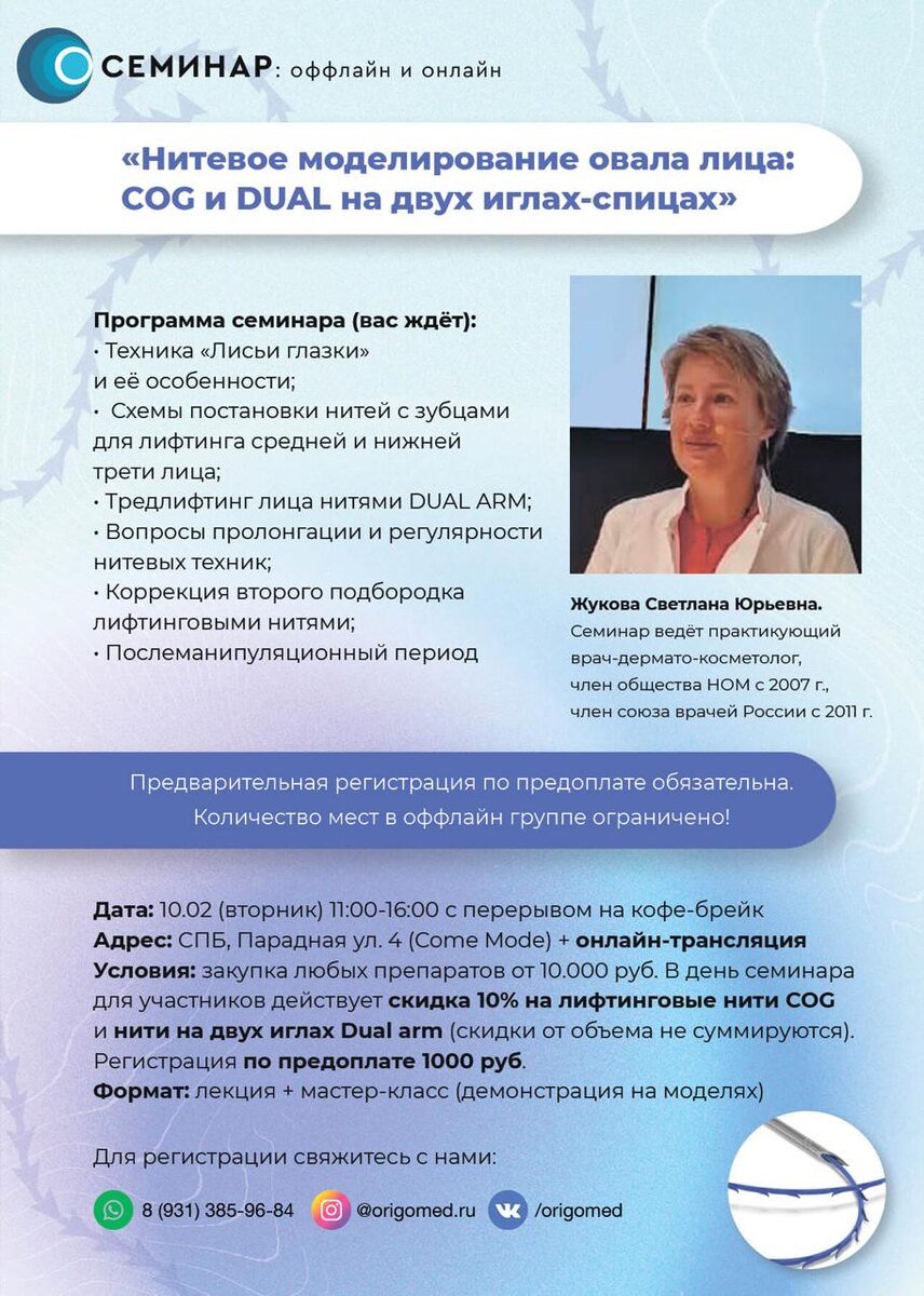 🔥 Друзья! Рады анонсировать долгожданный семинар по лифтинговым нитям COG и DUAL ARM на тему: «Нитевое моделирование овала лица: COG и DUAL на двух иглах-спицах» 🔥 Пройдёт он 10 февраля (вторник) в 11:00. 🏠 Проходит оффлайн в Петербурге + трансляция в высоком качестве для врачей из регионов 💕 👩⚕️ Спикер - Жукова Светлана Юрьевна - практикующий врач дермато-косметолог, член общества НОМ с 2007 г., член союза врачей России с 2011. 🔹 Тема: « Нитевое моделирование овала лица: COG и DUAL на двух иглах-спицах » 🔹 На семинаре вас ждёт (программа семинара) : * Техника «Лисьи глазки» и её особенности; * Схемы постановки нитей с зубцами для лифтинга средней и нижней трети лица; * Тредлифтинг лица нитями DUAL ARM; * Вопросы пролонгации и регулярности нитевых техник; * Коррекция второго подбородка лифтинговыми нитями; * Послеманипуляционный период Для регистрации напишите нам либо поставьте "+" в ответном сообщении ❤️