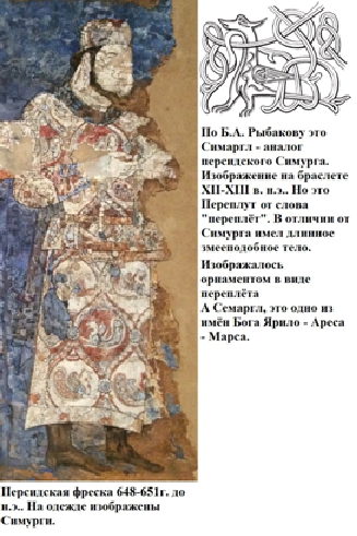 Сейчас большую активность в международной афере врагов России по фальсификации её истории проявляют осетины. Они пытаются «доказать», что это они бывшие скифы и раньше владели всей территорией нынешней России, а русские здесь "понаехали". Метод они выбрали оригинальный – внесение изменений в свой язык. Если украинцы и другие «славяне» вносили изменения в свой язык, чтобы отдалить его от русского, то осетины, наоборот, вносят в собственный словарь слова, близкие к русским, но заявляют, что это русские у них заимствовали в древности, когда они владели всей территорией России. В предыдущих главах уже приводился пример двух значений для слов «вода» и «река» в осетинском языке. Одно для фальсификации истории России, другое для употребления. Оппонент - осетин в Интернет заявил, что Божество Семаргл заимствовано русскими у них. Что это за Семаргл? Это Божество согласно ПВЛ было в Пантеоне князя Владимира Святославича: Перун, Хорос, Даждьбог, Семаргл, Стрибог, Макошь. Но в этом списке нет Бога Ярило, что немыслимо. Ярило или Арес был одним из главных Богов славян и русских. Он был покровителем Скифии, самоназванием которой было Россия. Поэтому рассмотрим внимательнее имя Божества Семаргл, которое русским практически не знакомо. В нём "се", это указательная приставка древнерусского языка, а "мар", это "смерть". Здесь и скрывается имя Бога Ареса - Ярилы. Вспомним, что у древних римлян Арес имел имя МАРс. В каких-то преданиях Семаргл считался огненным Божеством. Однако "учёные", в частности, академик Б. Рыбаков решили в очередной раз натянуть презерватив на глобус и отождествить русского летописного Семаргла с персидским Симургом, где это царь птиц, крылатая собака. В подтверждение академик Б. Рыбаков приводит древние изображения крылатых собак на русских фресках.