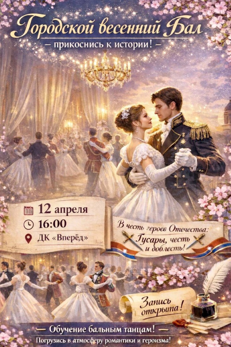 ! 💃Наш город вновь окунётся в эпоху изящных манер и танцевальных традиций. 12 апреля в ДК «Вперёд» состоится долгожданный городской бал. В этом году тема бала — «Герои нашей страны, Защитники Отечества». За основу организаторы взяли исторический образ гусара. 🤺Гости смогут увидеть коронную гусарскую мазурку, задорную польку, захватывающий мужской танец с фланкировкой и другие номера. Мероприятие открыто для всех желающих — как в качестве зрителей, так и в качестве танцоров! К репетициям можно присоединиться абсолютно бесплатно: · Где: Комплексный молодежный центр (ул. Молодёжная, д.18) · Когда: по пятницам в 20:00 (возрастная категория 14+) · Важно: время и другие нюансы можно обсудить с педагогом по телефону: 8-903-512-01-31 (Надежда Васильевна). Посетителям бала нужно будет соблюсти дресс-код: 👗дамам - платья полной длины, перчатки, 🤵кавалерам – классические костюмы. Итак, бал состоится 12 апреля в 16:00 в ДК «Вперёд» (пл. Собина, д.3). Обязательно приходите! Такое пропуст