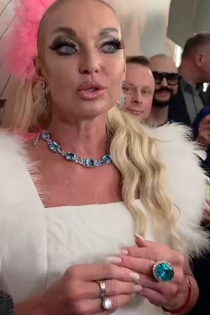 Она надела белоснежное платье с рукавами из перьев и ожерелье и крупные серьги с большими голубыми камнями под цвет глаз. Волосы Волочковой гладко зачесали, а хвост уложили красивыми волнами. Казалось бы должен был получиться образ прекрасного лебедя.
