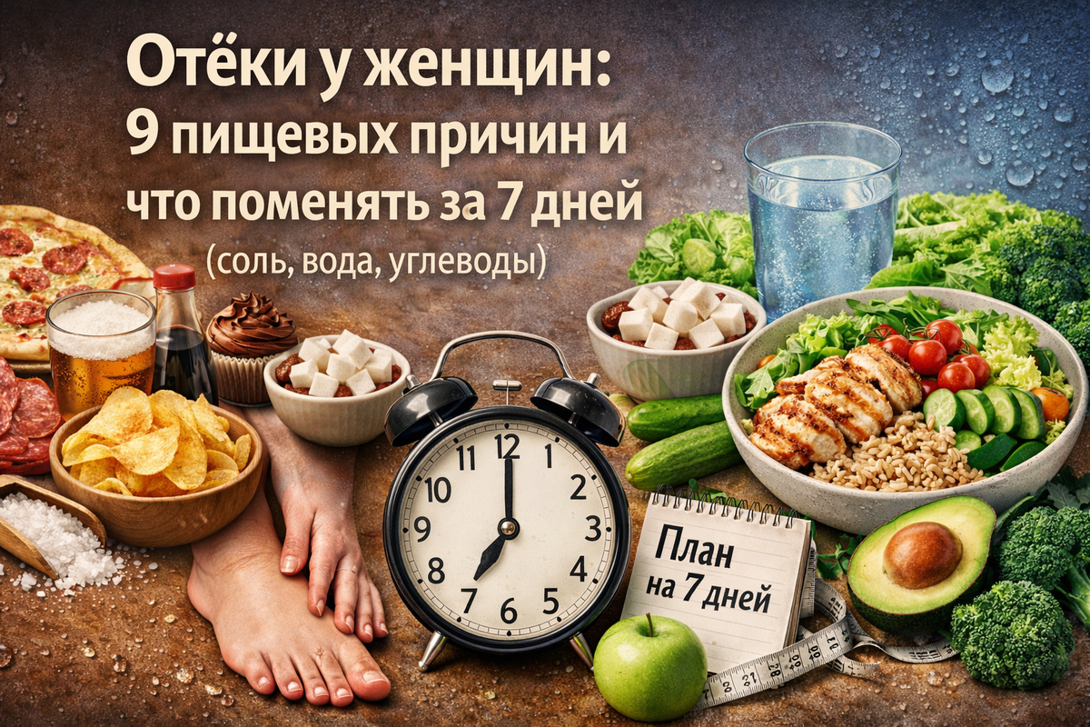 У большинства женщин отёки усиливаются из-за скрытой соли, позднего ужина, недосыпа и сладко-солёных “качелей”. Начни с 7-дневного плана — и ты увидишь, что конкретно влияет на тебя.