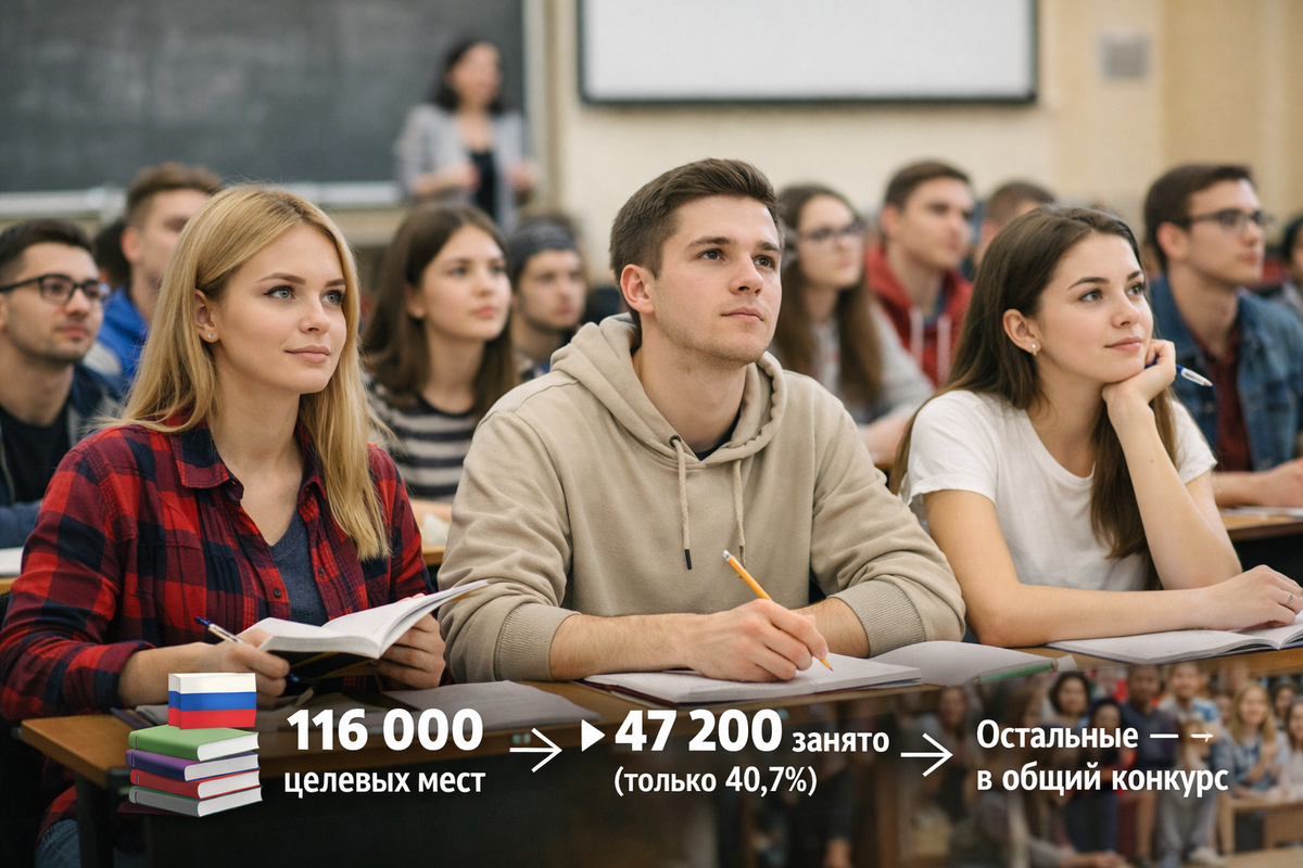 Каждый год абитуриентов пугают фразами вроде: «бюджета почти нет», «всё забрали целевики», «без олимпиад туда не попасть». Но свежие данные показывают совсем другую картину. 📊 Что показала статистика Минобрнауки В 2025 году вузы получили 116 тысяч целевых мест, но реально занятыми оказались только 47,2 тысячи - это 40,7% от всей квоты. Да, по сравнению с прошлым годом показатель вырос, но большая часть целевых мест так и не была использована и в итоге перешла в общий конкурс. 👉 То есть бюджетные места не исчезли - они просто вернулись туда, куда поступает большинство абитуриентов. 🎓 Почему целевое обучение выбирают не все Целевое поступление - это: • отдельная квота; • договор с вузом и будущим работодателем; • обязательная отработка 3–5 лет после выпуска. Обучение полностью оплачивается государством, но условия подходят далеко не всем. Именно поэтому многие целевые места остаются пустыми. 🩺 Где целевиков больше всего Самые популярные направления: • медицина • педагогика Больше